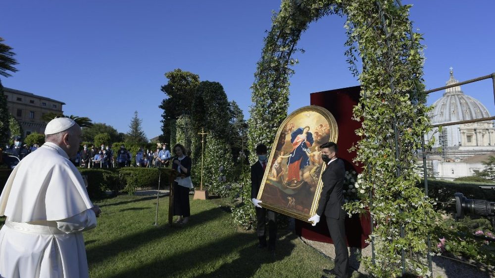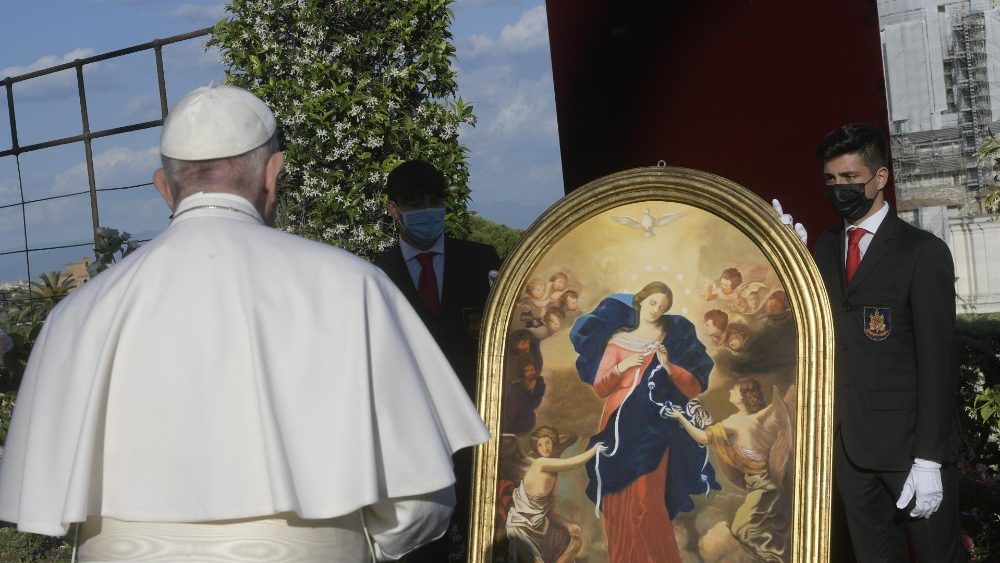 “Todos os dias, segurando entre as mãos a coroa do Santo Rosário, dirigimos os nossos olhos a ti, Mãe de misericórdia, suplicando para que acabe a pandemia e a humanidade possa retomar a vida de cada dia com mais segurança”, rezou o Santo Padre diante de uma imagem de Nossa Senhora Desatadora de Nós, nos Jardins Vaticanos.